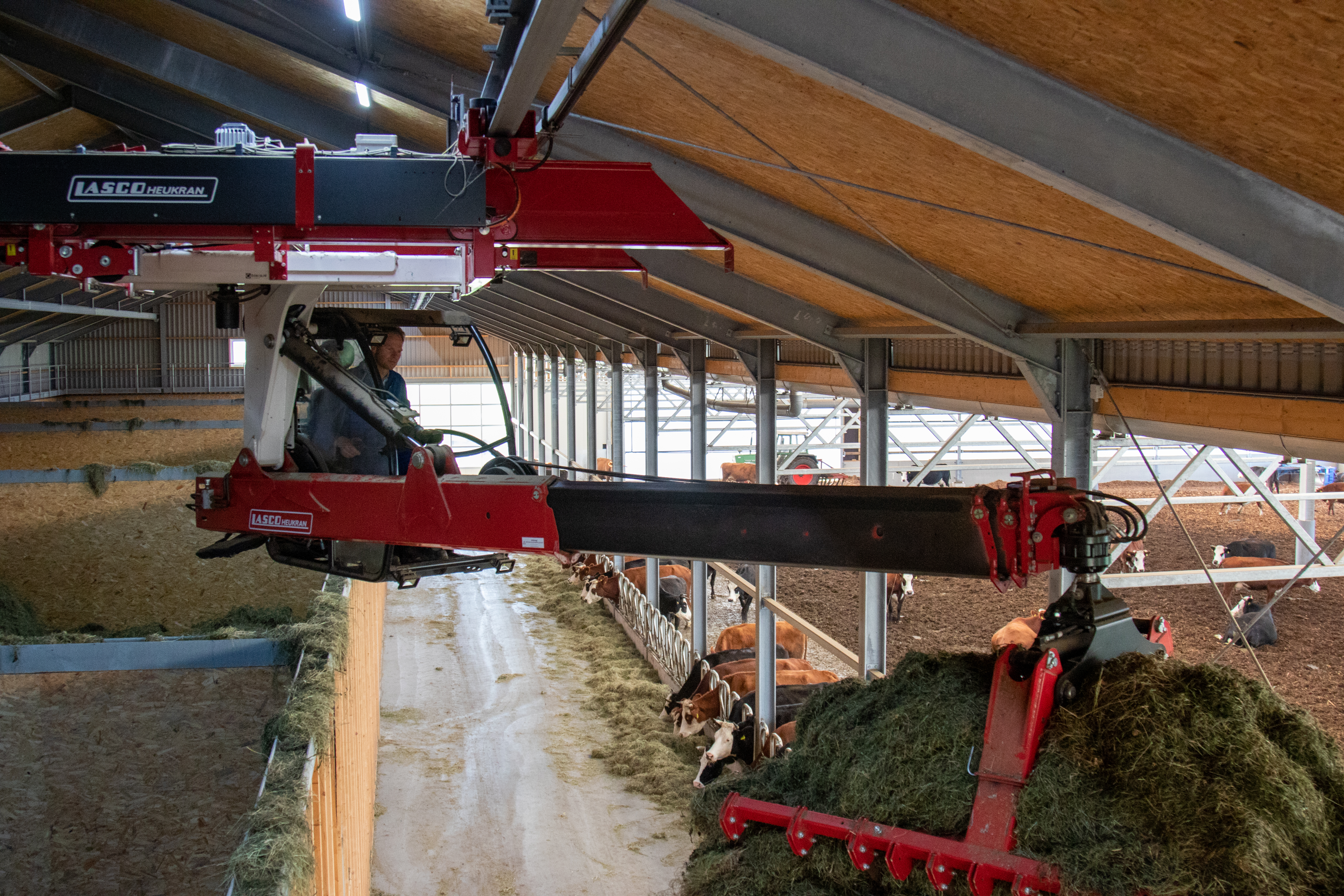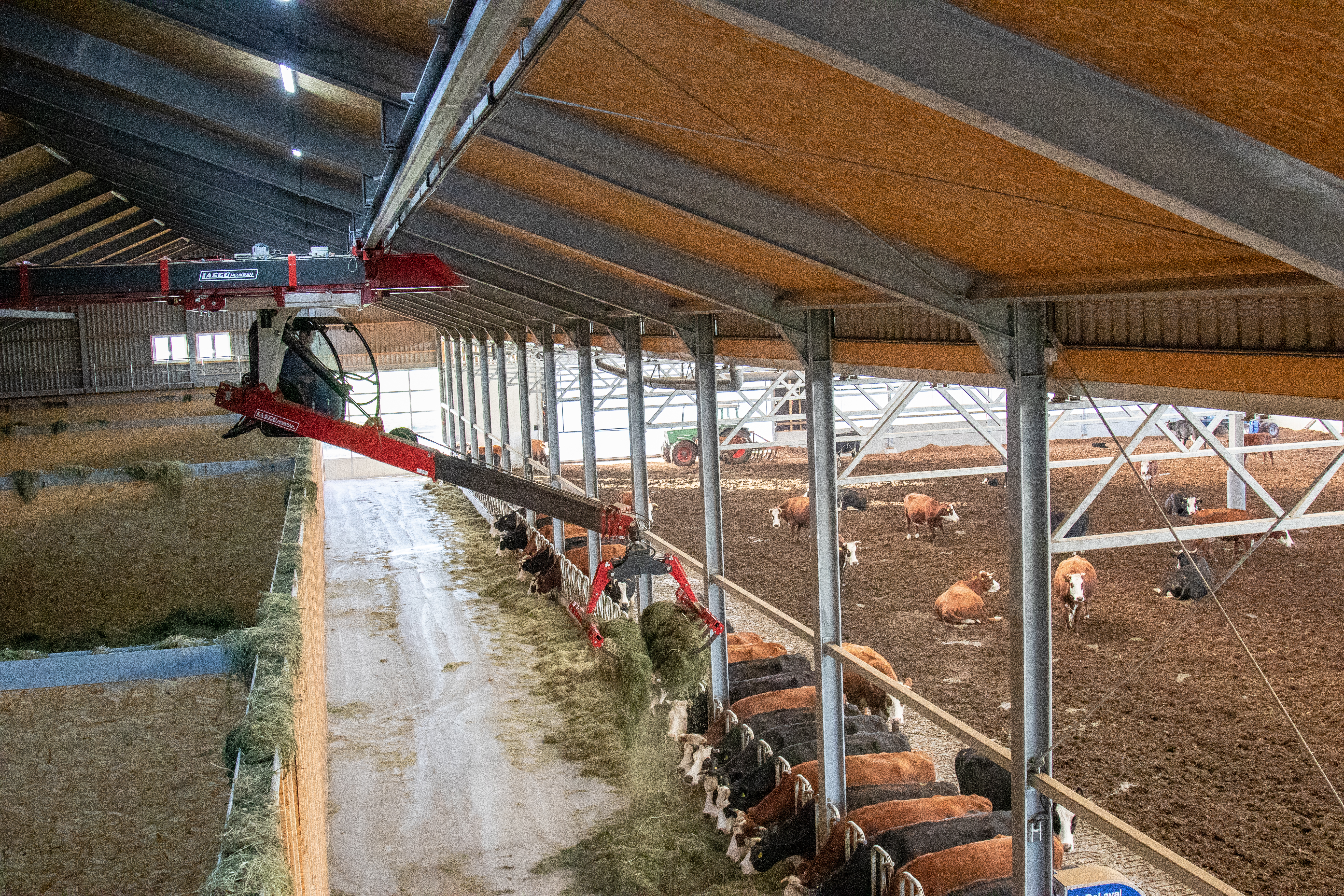 Naast onze mooie en ruime vrijloopstal hebben we op onze boerderij een schuur gebouw waar we al het gras voor de koeien drogen voor de winter, dit noemen we onze hooidroogschuur. Er wordt hier op de boerderij geen gras meer ingekuild onder plastic maar alles wordt tot hooi gedroogd. De schuur bestaat uit 5 grote hooibakken waar in de zomer het verse gras van het land netjes wordt opgestapeld met een kraan die boven in de stal hangt. Vervolgens wordt het gras gedroogd. Dit gebeurt overdag met warme lucht die wordt afgezogen van het dubbele en zwarte dak en in de nacht wordt er gebruik gemaakt van houtkachels die de lucht dan verwarmen. Na 3 à 4 dagen heb je dan heerlijk hooi. Het hooi blijft in de hooibakken voordat het nodig is om de koeien in de stal te voeren. In de winter wordt het hooi vanuit de hooibakken weer voor de koeien gelegd. Het systeem van hooidrogen komt uit Oostenrijk waar dit veel gebeurtenissen. Het voordeel van deze manier van grasdrogen is dat het eiwit goed in het gras blijft, zodat de koeien goede en gezonde melk kunnen produceren. De koeien vinden het hooi heerlijk.