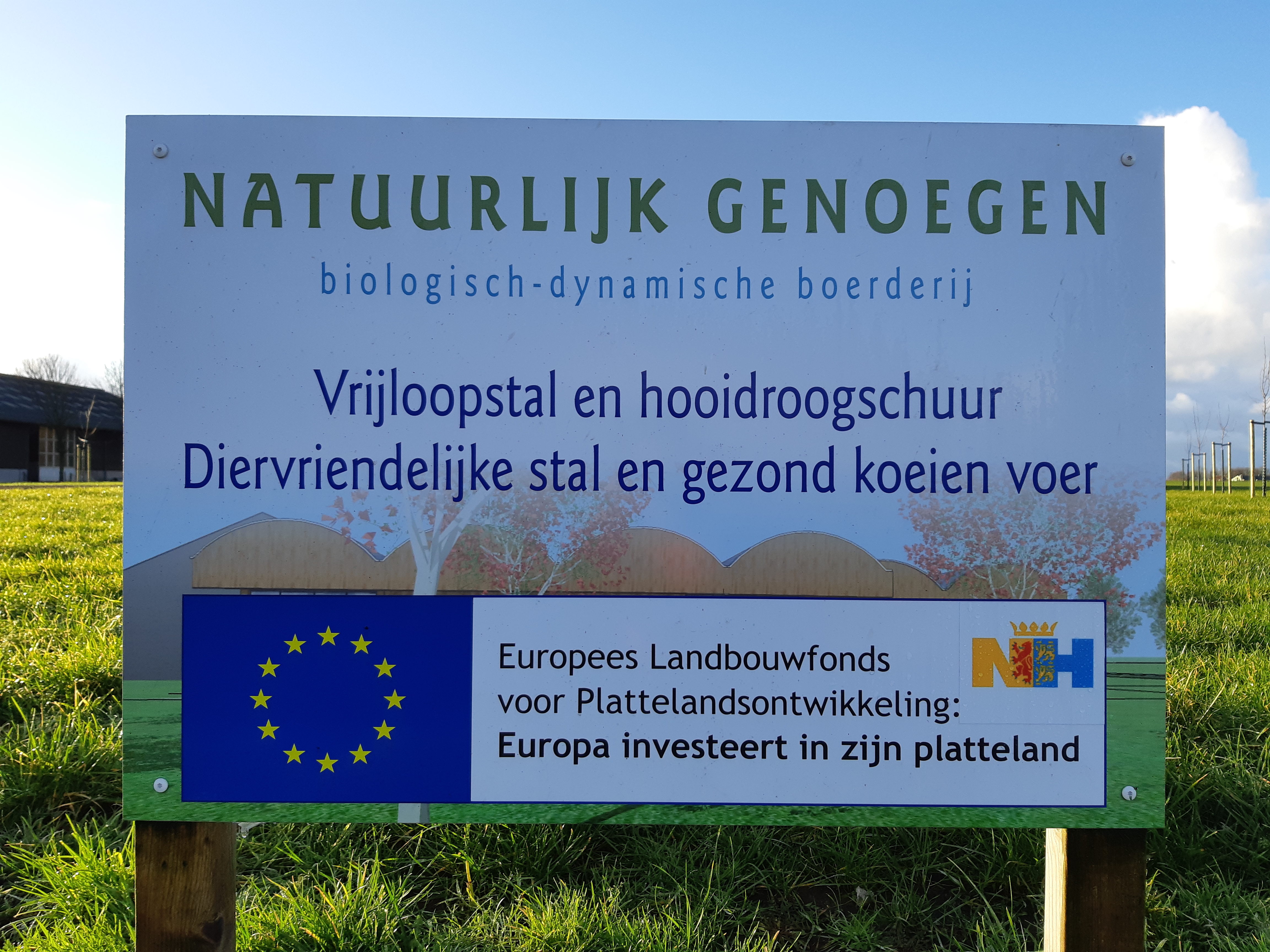 In 2020 is onze nieuwe vrijloopstal met hooidroog schuur in gebruik genomen. De koeien lopen in een grote vrije ruimte rond en ze kunnen heerlijk liggen op een bodem van houtsnippers. Het is een hele open stal met een goed klimaat voor de koeien. Het huisvestingssysteem is gericht op het verkrijgen van een optimaal dierenwelzijn en een goede kwaliteit mest voor op de graslanden. Een goede kwaliteit mest is belangrijk voor het bodemleven. Een optimaal dierenwelzijn wordt vergroot omdat de koeien hun natuurlijk gedrag in de stallen kunnen laten zien. Bij Natuurlijk Genoegen worden de koeien niet onthoornd omdat dit onderdeel van het koe wezen is. In een kudde is een rangorde waardoor, zeker met hoorns, het nodig is dat de koeien voldoende ruimte hebben en dat ze kunnen vluchten indien nodig. De melkkoeien liggen in de winter op een dikke laag houtsnippers en de jonge koeien en kalveren op een dikke laag stro. De koeien kunnen zo droog en schoon liggen. De kalfjes die geboren worden blijven gedurende de eerste levensperiode bij de moeder of soms een pleegmoeder drinken. De aanwezige fokstier heeft een ruim hok waar hij de koeien kunnen dekken. Al het vrouwelijke jongvee wordt opgefokt voor de toekomstige melkvee, alle stierkalveren gaan naar een kalfsverenhouder in Barneveld.